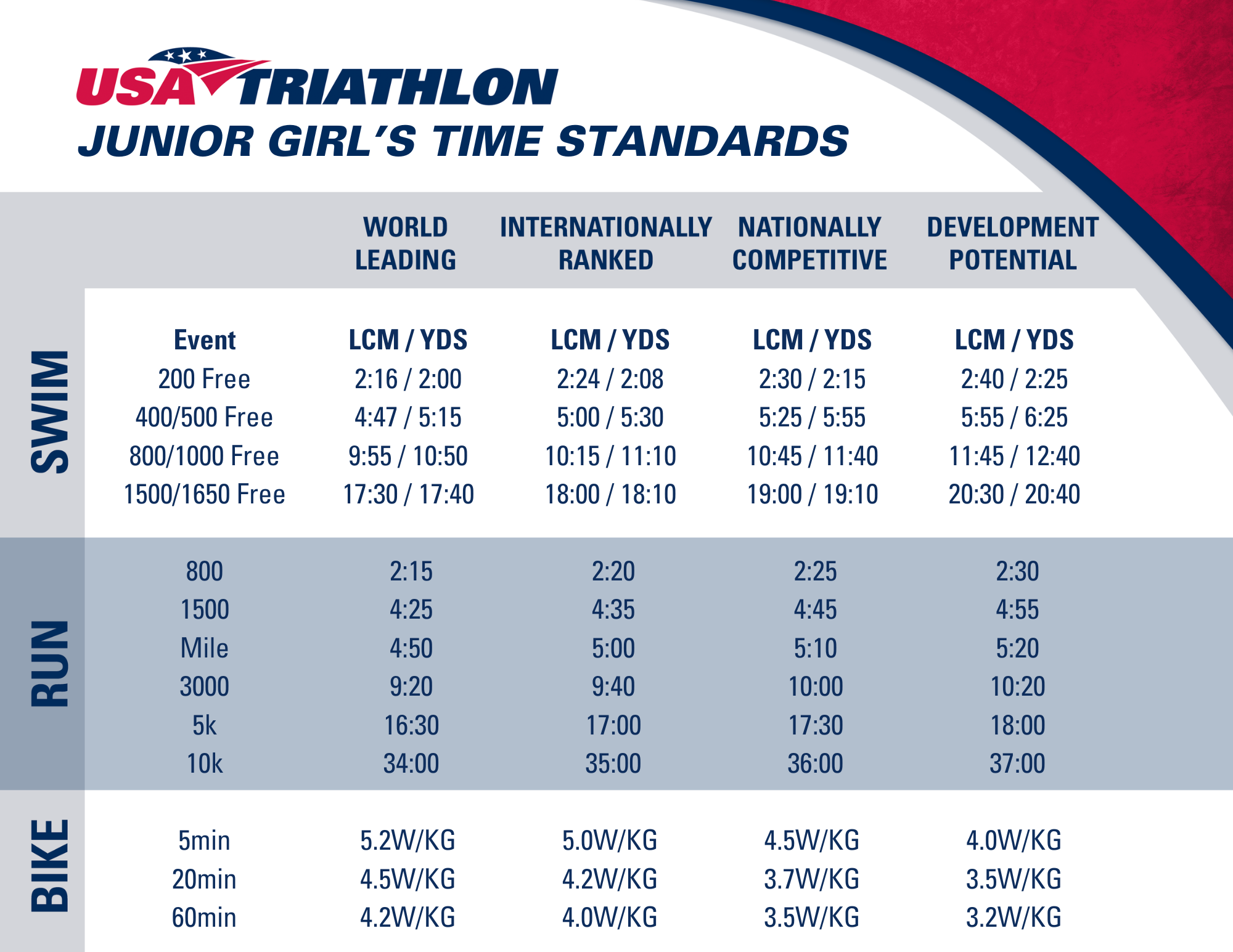 Development Potential swim and run times are an average of what the top athletes at domestic Draft Legal races are capable of doing in those individual events.